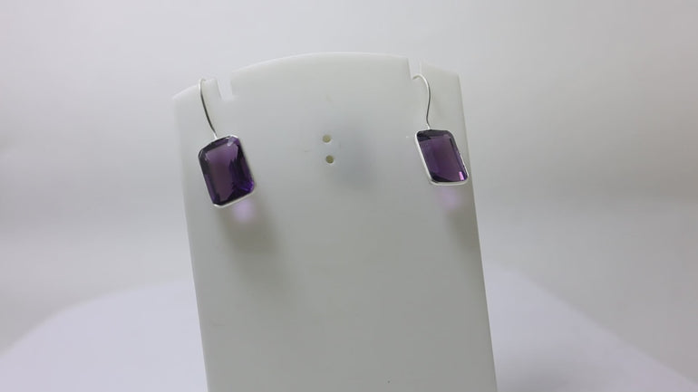 These elegant drop earrings feature genuine amethyst gemstones set in a polished silver frame. The earrings are crafted from high-quality silver, ensuring durability and a lasting shine. Each earring showcases a rectangular, faceted amethyst, known for its rich purple hue. These earrings are designed for comfortable wear with a secure hook closure. These amethyst earrings are a perfect choice for adding a touch of elegance to any outfit. Ideal for daily wear or gifting, these gemstone earrings will make a statement. The amethyst is a beautiful gemstone that is believed to bring peace and calm to the wearer, so make it a part of your daily wear.