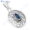 925 sterling silver pendant with a marquise-cut blue gemstone. Features an openwork design.