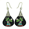 These elegant dangle earrings feature a unique design with sterling silver and black onyx. The earrings are adorned with vibrant gemstones in red, turquoise, and green hues, adding a pop of color and charm. Crafted from high-quality 925 sterling silver, ensuring durability and a lasting shine. The earrings are hypoallergenic and suitable for sensitive ears. The intricate details and colorful gemstones make them ideal for daily wear or gifting. These silver earrings are designed to be a timeless addition to any jewelry collection.