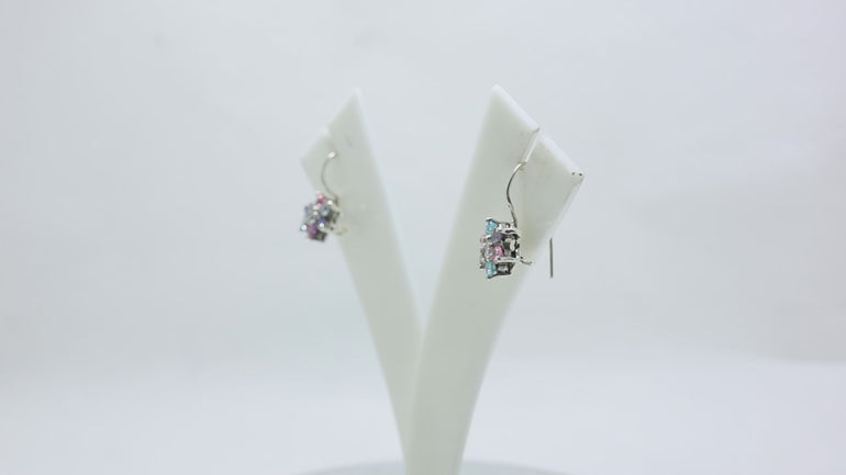 These elegant earrings feature a floral design crafted from high-quality silver. Each earring showcases a cluster of vibrant, multicolor gemstones, adding a touch of sparkle. The earrings are designed for comfortable wear, perfect for sensitive ears. These earrings are ideal for daily wear or gifting, offering a blend of style and durability. The versatile design complements various outfits, making them a must-have addition to any jewelry collection. These earrings are made to last and will make a great gift.