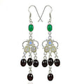 These elegant dangle earrings feature a captivating design with 925 sterling silver. The earrings showcase a combination of gemstones, including green and black stones, adding a touch of color and sophistication. Crafted for durability and hypoallergenic, these earrings are ideal for sensitive skin. They are perfect for daily wear or gifting. The earrings offer a unique style, combining silver with shimmering gemstones. These earrings would be a perfect addition to any jewelry collection. The secure hook closure ensures comfortable wear.