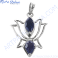925 sterling silver lotus pendant necklace with pear-shaped blue iolite gemstones.
