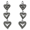These elegant earrings feature a triple-heart design crafted from 925 sterling silver, embellished with sparkling marcasite stones. The heart-shaped design adds a touch of romance, making them suitable for various occasions. These drop earrings are a timeless addition to any jewelry collection. The secure hook closure ensures comfortable wear. Marcasite earrings are a classic choice and are ideal for those seeking a touch of vintage flair. The hypoallergenic and tarnish-resistant properties make them suitable for everyday wear. These earrings are a perfect gift for her.