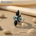 This stunning ring is crafted from high-quality 925 sterling silver. Featuring a unique design, it incorporates two teardrop-shaped onyx stones and several small turquoise gemstones. The ring's silver setting enhances the colors of the stones. This ring is ideal for daily wear or gifting and showcases a blend of elegance and durability. Its polished finish provides a comfortable fit. This piece is a testament to quality craftsmanship and enduring style, making it a perfect addition to any jewelry collection. Its design makes it an excellent choice for those seeking a statement piece.
