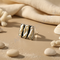 Sterling silver ring featuring three elongated pearl gemstones on a white background.