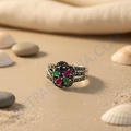 This exquisite ring features a captivating flower design crafted from 925 sterling silver. The ring showcases a cluster of gemstones, including red and green stones, arranged to form a flower. This sterling silver ring is ideal for daily wear or gifting. The meticulous craftsmanship ensures durability and a comfortable fit. Embrace the elegance of this unique ring, perfect for adding a touch of color to your look. This beautiful ring is hypoallergenic and tarnish-resistant, ensuring long-lasting shine. Discover the beauty of gemstone jewelry and elevate your style.